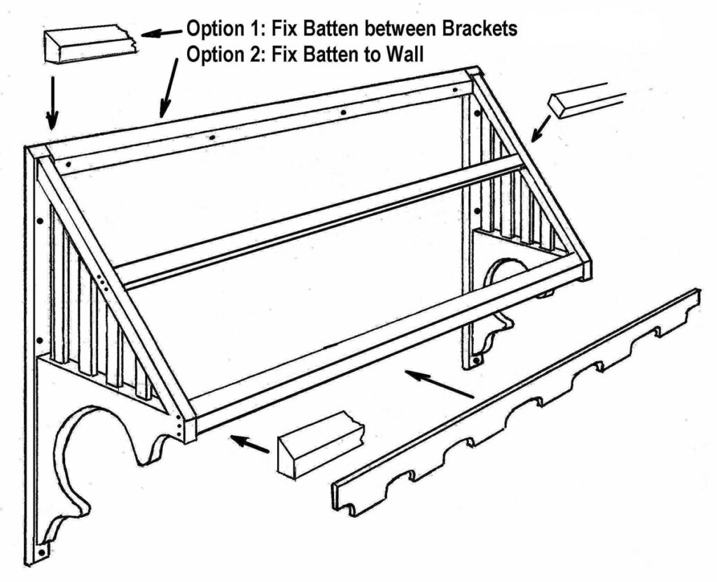 - Decide whether you want the top batten to be fixed to the wall (the wall may be too uneven or too rough a surface), or between the brackets. Extra screws are provided for fixing to the wall