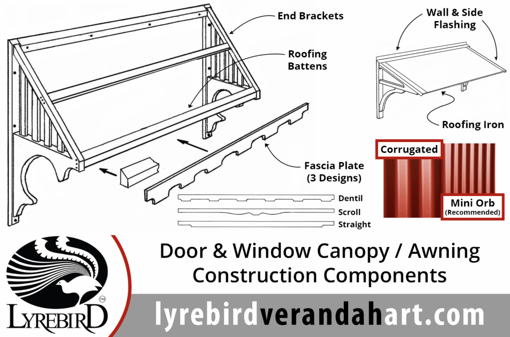 Lyrebird’s hugely popular Door and Window Canopy / Window Awning range suits both heritage and modern home designs. They provide many benefits – both to your lifestyle and the value of your home – and are a sustainable way to reduce your energy bills. Our Door and Window Canopy / Window Awning Kits include everything you need – from the timber brackets and components, to the roofing iron and flashing, down to the screws that hold it all together. Made from high-quality timber and LOSP(H3) treated pine, our Door and Window Canopy / Window Awning are designed to withstand the harsh Australian sun and stand the test of time. Read our Order Guide – Door and Window Canopy Kits for more.