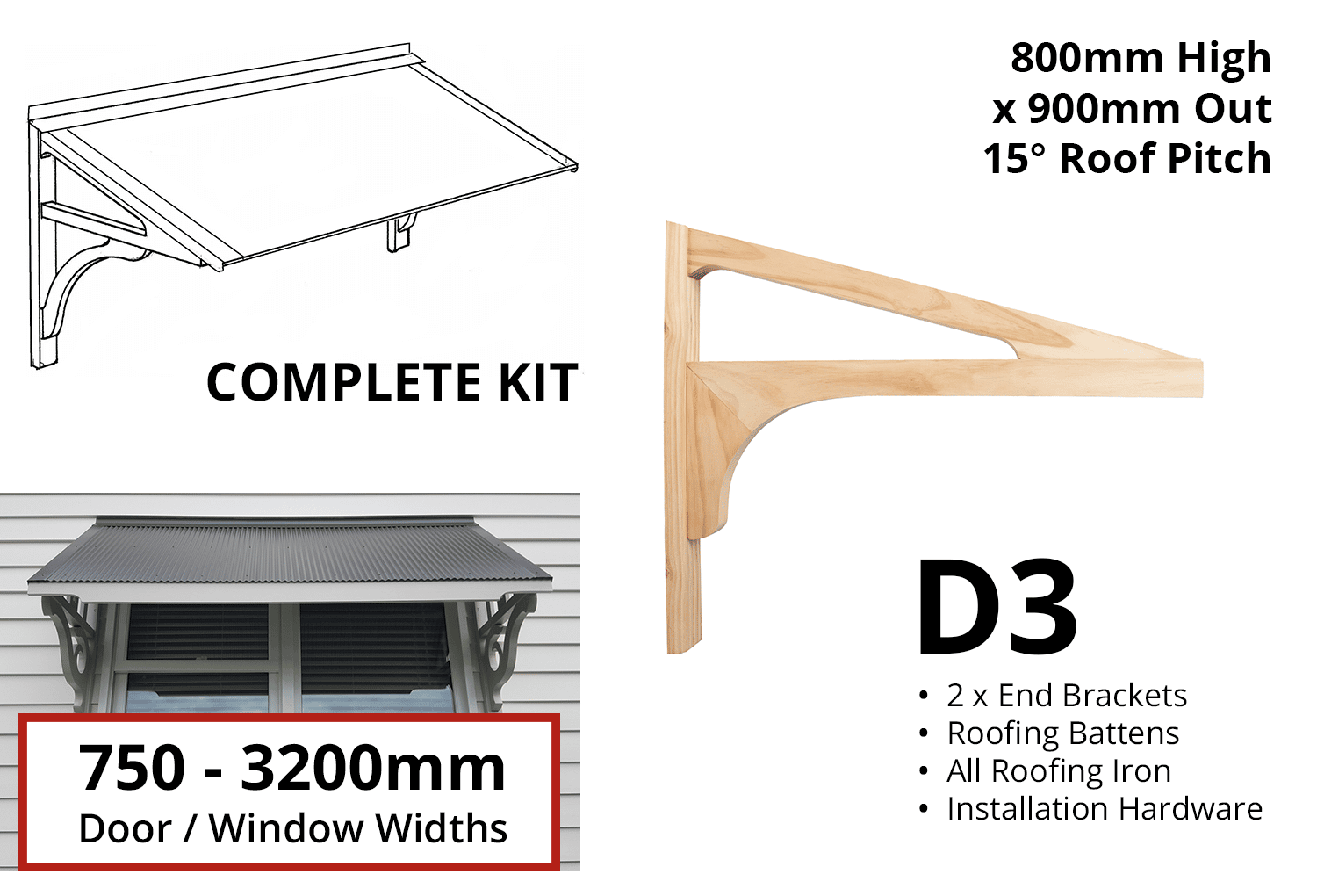 Door Canopy Kit – Profile: D3 for these maximum widths – 750, 1100, 1600, 1900, 2300, 2700, 3200mm