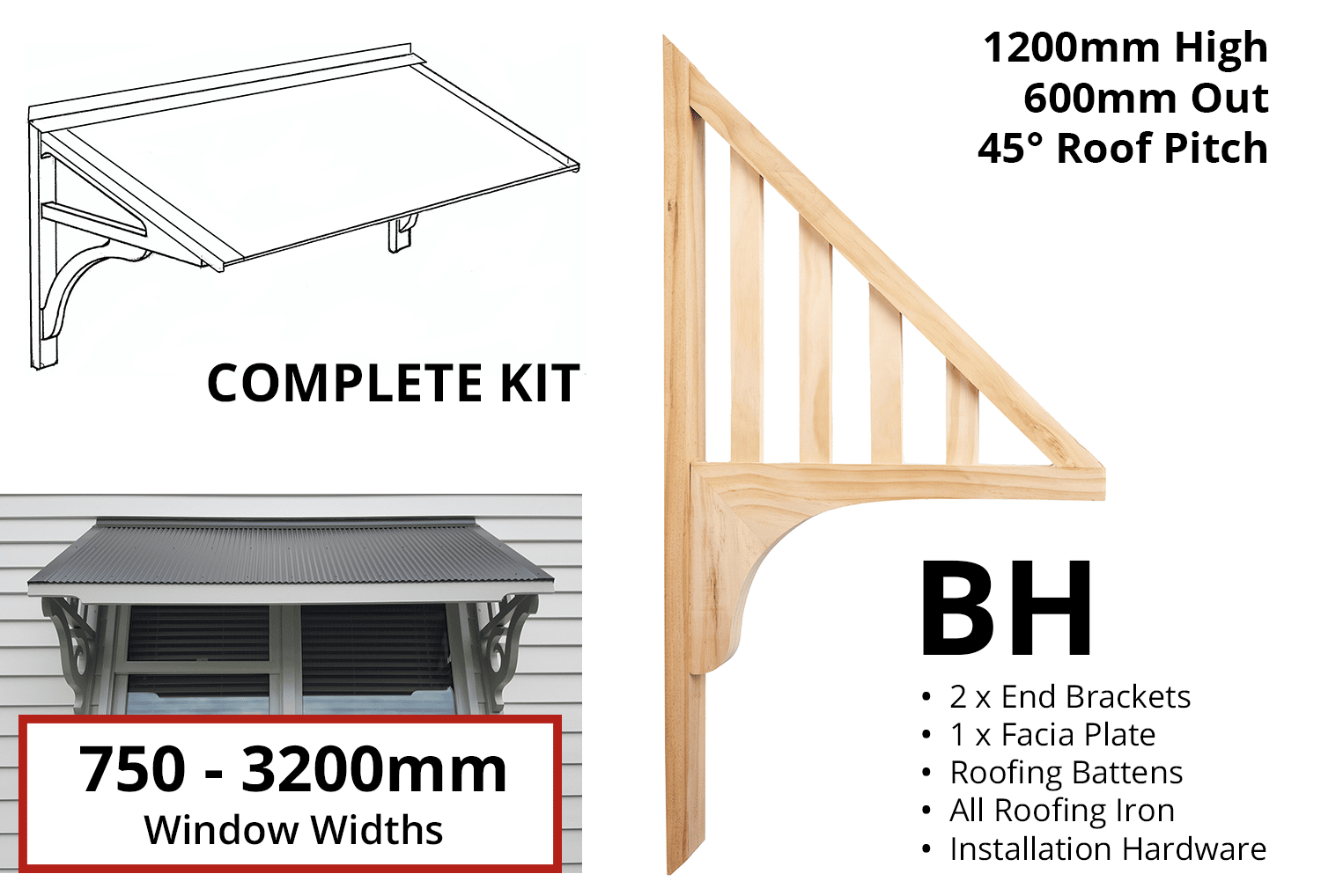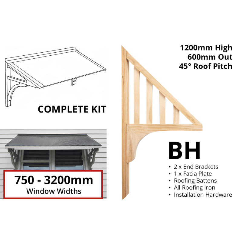 Window Canopy Kit – Profile: BH for these maximum window widths – 750, 1100, 1600, 1900, 2300, 2700, 3200mm